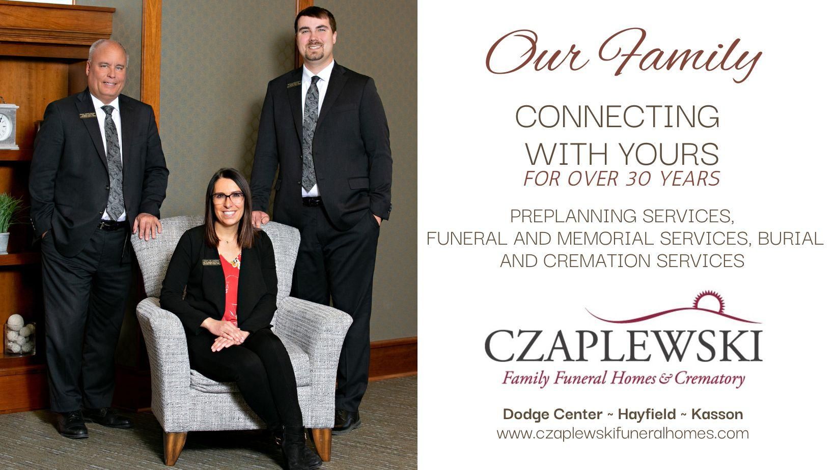 At Czaplewski Family Funeral Homes & Crematory, families have relied on us for compassionate funeral services. We take great pride in the funeral services we provide in Dodge County and surrounding areas in Minnesota. Our focus is to provide individualized funeral services designed to meet the needs of each family. We will guide you through all aspects of your loved one's funeral or memorial service. Contact us today if you need funeral services at (507) 634-6510.